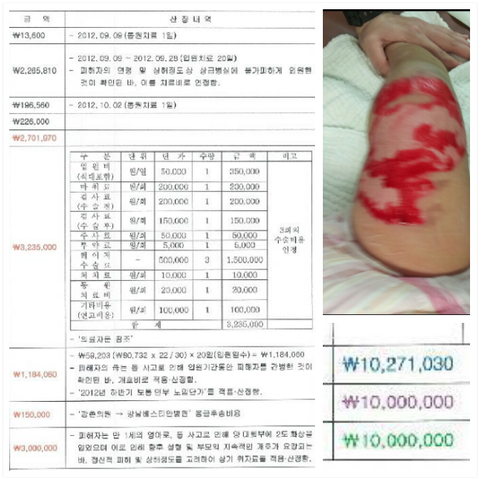 사진은 처음 화상당시 보험사 요청으로 찍은 심한쪽 다리와 보험사측 측정 금액이다.