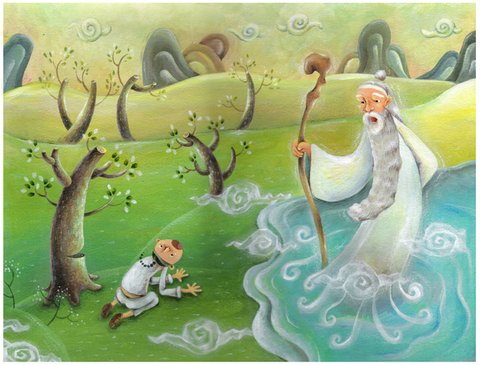 역시 흰색 옷과 흰수염, 흰머리에 지팡이를 쥔 산신령.