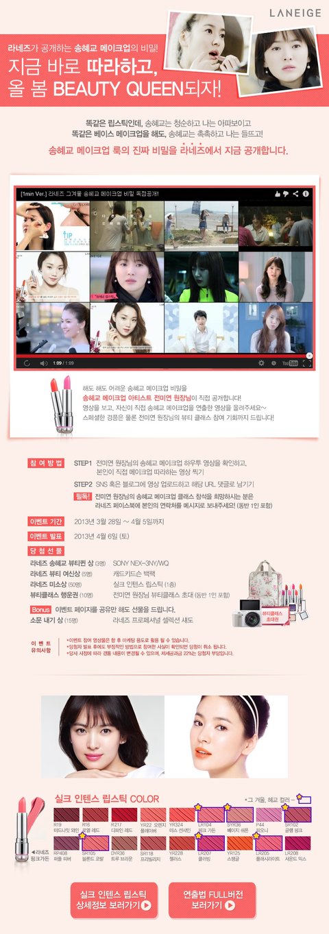지금 라네즈 페이스북에서 송혜교 메이크업 따라잡기 이벤트 중이에요
