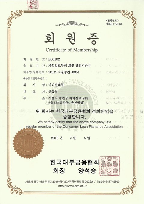 혹시라도 아이티전당포(IT전당포) 방문해서 정식대부업협회에 가입한 회원증이 걸려 있는지