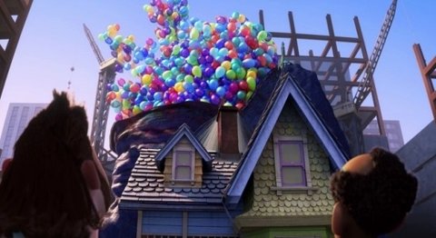 집에 엄청난 숫자의 헬륨 풍선을 달고 남아메리카로 떠서 날아가는 장면!