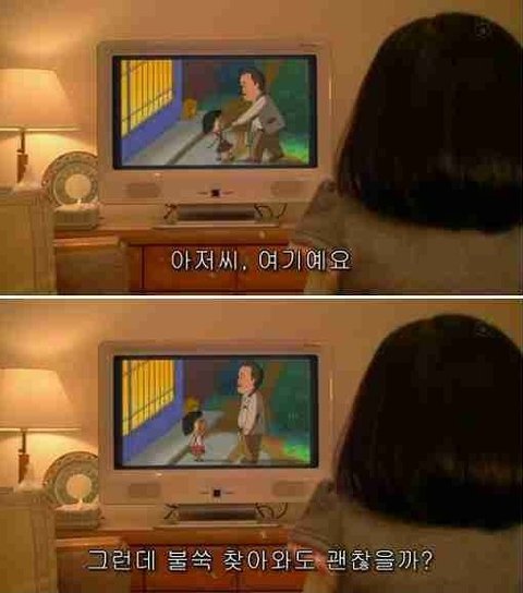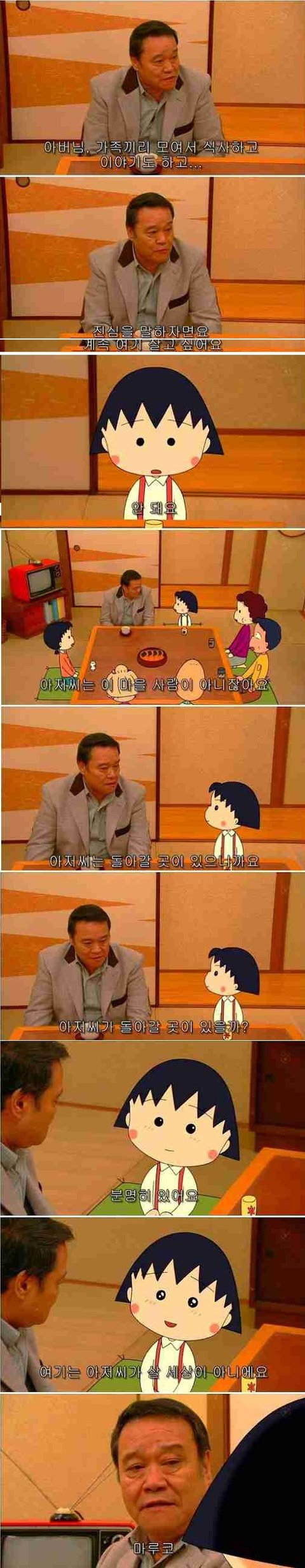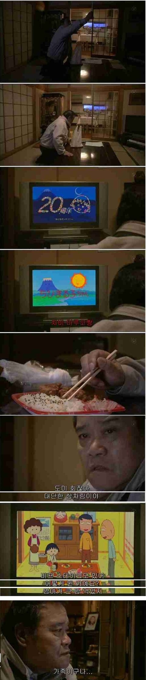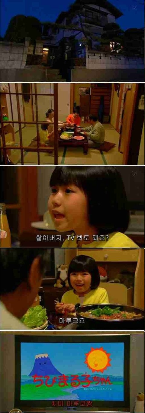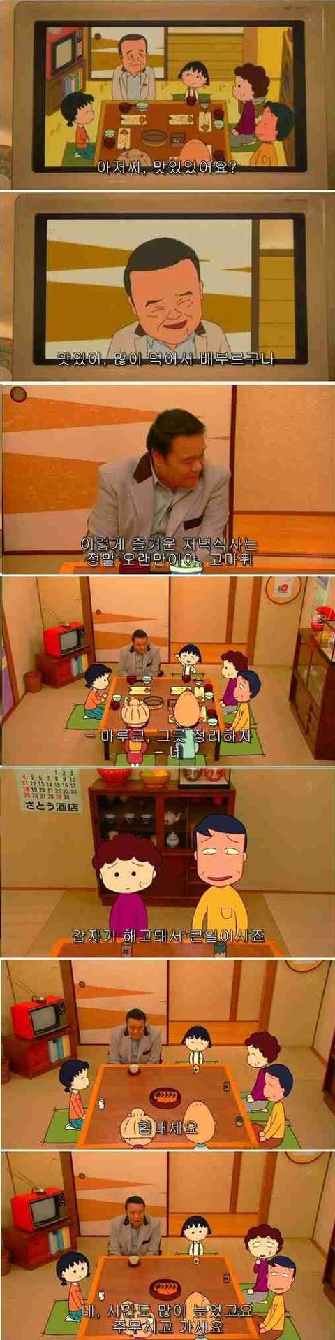 tv에선 마루코라는 여자아이가 주인공으로 나오고 그 마루코와 그아이의 가족들의 이야기가 주가 되는 내용의 만화가 나옴. 가족이 함께 모여 식사를 하는 장면에 쓸쓸함과 약간의 부러움, 그리움 같은 감정을 느끼는듯한 남주.