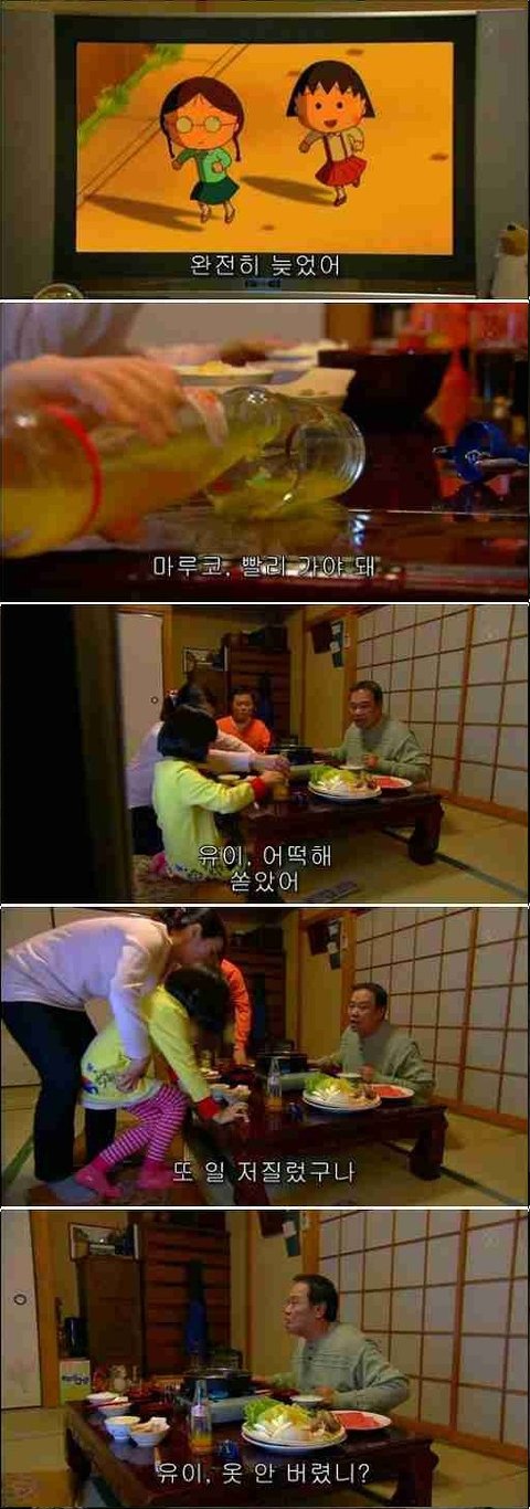 마루코를 튼 손녀는 만화를 보다가 실수로 물을 엎질렀고, 손녀를 혼자 데리고 나가도 될것을 꼭 굳이 둘이 데리고 나가는 딸과 사위ㅋㅋ