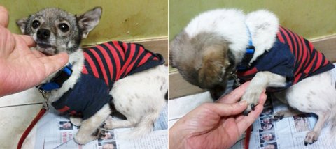 사료가 함께 들어 있었고 유행사 봉사자들은 당연히 캠페인 장소에서 이 녀석을 입양 보내려 했으나 봉사자 전원과 입양 의사 있으셨던 분 들 모두를 다 물어 피 를 다 봤다고 저녁에 그 유행사 리더인친구가 캠페인 끝나고 병원으로 자기야! 얘 가 입질이 심 해 서 감당이 안된다고 데려온 가련한 녀석!