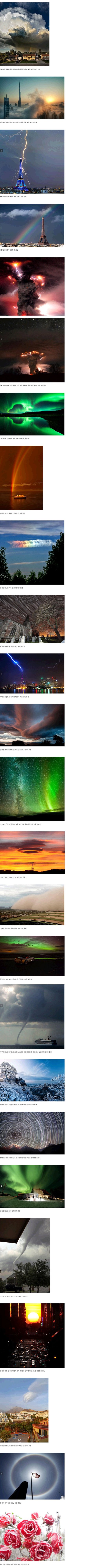 1.캐나다 한 마을에 폭풍우, 토네이도, 무지개가 동시에 포착된 기이한 현상 2.세계에서 가장 높은 빌딩 브루주 칼리파와 고층 빌딩에 생긴 안개 3.프랑스 파리의 에펠탑에 번개가 치고 있는 모습 4.에펠탑 사이로 무지개가 뜬 모습 5.칠레의 푸예우에 화산 폭팔로 인해 생긴 구름으로 화산 번개가 생성되는 과정이다(2장) 6.아이슬란드 Skaftafell 국립 공원에 나타난 북극광 7.호주 빅토리아 벨라닌 반도에 뜬 쌍무지개 8.미국 일리노이주에 뜬 기이한 오색구름 9.별의 일주 운동을 11시간동안 촬영한 모습 10.캐나다 토론토 CN타워에 번개가 치고있는 모습 11.영국 컴브리아에 나타난 거대한 독수리 모양의 구름 12.노르웨이 핀마르크주에서 북극광, 은하수, 유성이 동시에 포착된 사진 13.스페인 빌바오에 나타난 UFO모양의 구름 14.미국 애리조나주 피닉스에서 생긴 모래 폭풍 15.잉글랜드 노섬벌랜드 린디스판 연안에서 포착된 북극광 16.서부 카브리해에 위치하고 있는 그랜드 케이먼 케이만 군도에서 발생한 워터 싸이클론 17.영국 브리스톨에 있는 클리프톤 서스팬션 브리지의 겨울 풍경 18.히말라야 에베레스트 산의 밤 하늘에 별의 일주운동을 촬영한모습 19.미국 알레스카에서 포착된 북극광 20.미국 텍사스주 던텐 카운티에 나타난 토네이도 21.미국 뉴욕주 맨해튼 42번가 에서 일년에 한두번 나타나는 맨해튼헨지 현상 22.스페인 테네리페 섬에 나타난 기이한 손모양의 구름 23.미국의 국기 위로 나타난 태양 코로나 24.독일 프랑크푸르트의 한 정원에 얼어있는 빨간 장미 ---------------------------------------------------------------------- 쓰면서 아 모바일배려는 아무나 하는게 아니었구나를 느꼈음
