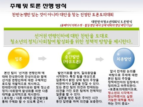 마지막으로 "2013년도 정책토론 특집"으로 지난 제 7회 토론토의대회에도 참여하셨던 분들이 이번 대회에 또 참여하시면 2013년 11월달에 "정책토론프로그램 수료증"을 받으실 수 있습니다. 또는 이번에 처음 대회를 알게되어 참여하시는 분들도 다음 8월, 10월 대회에 참여하시면 수료증을 받으실 수 있습니다.