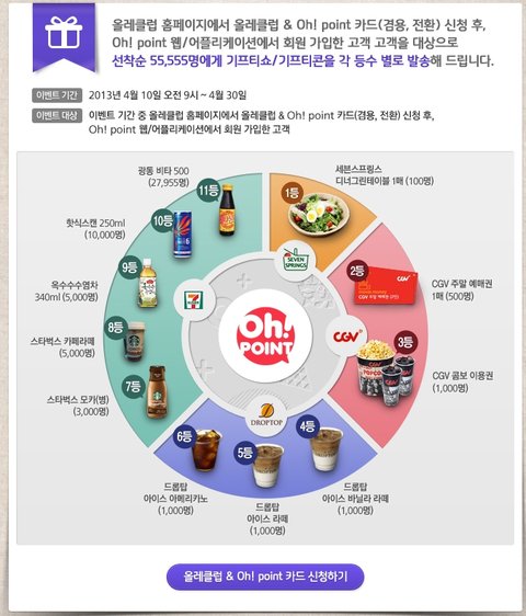 이번에 오포인트 카드 새로 나왔는데 올레클럽이랑 가치 쓸 수 있어서 이벤트 하네여.
