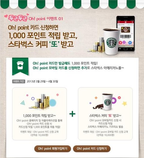 그리고 오포인트카드 신청만하면 1,000 포인트도 적립받고, 스타벅스 커피도 또 받을 수 있어요.