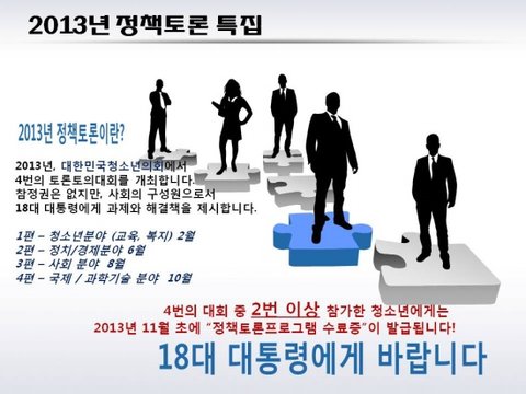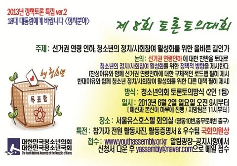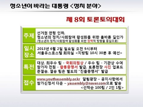 마지막으로 "2013년도 정책토론 특집"으로 지난 제 7회 토론토의대회에도 참여하셨던 분들이 이번 대회에 또 참여하시면 2013년 11월달에 "정책토론프로그램 수료증"을 받으실 수 있습니다. 또는 이번에 처음 대회를 알게되어 참여하시는 분들도 다음 8월, 10월 대회에 참여하시면 수료증을 받으실 수 있습니다.