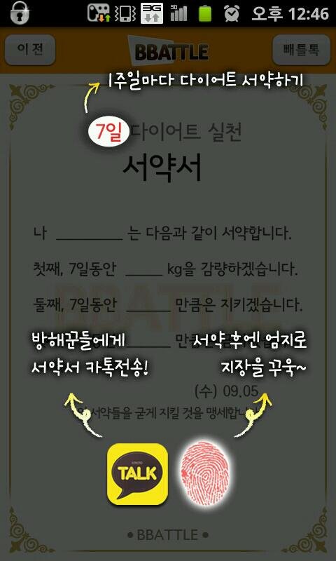 1주일마다 다이어트 서약서를 작성 할 수 있어요.