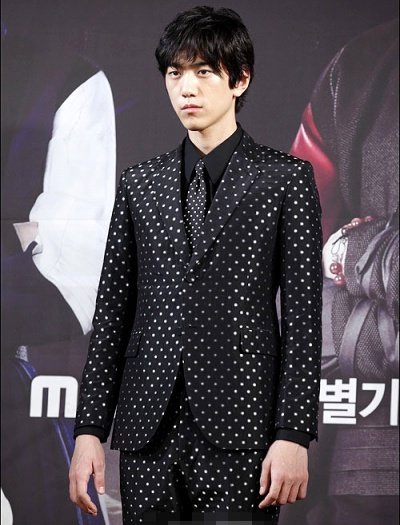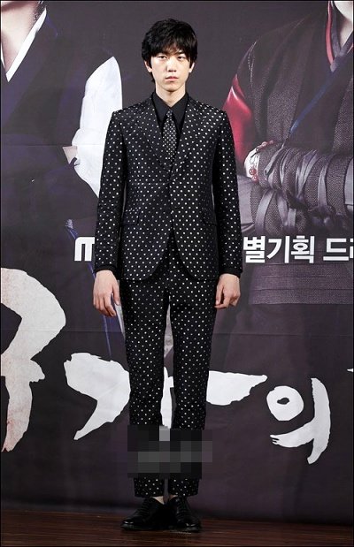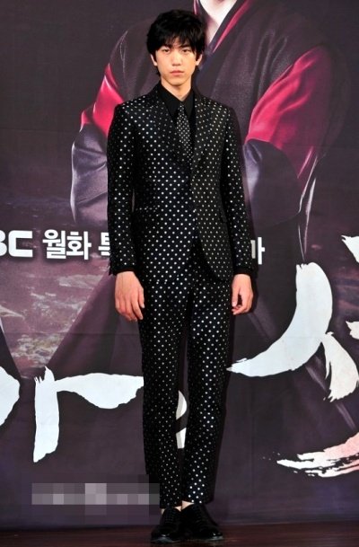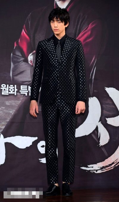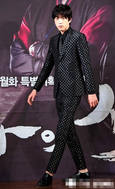 딱 봐도 확 튀는 물방울 무늬 수트를 입었는데