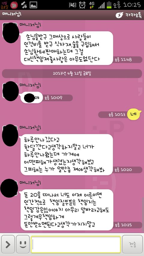 "그리고 여긴 회사가아니란다 회사였다면 틀렸겠지만 여긴 장사하는 곳인만큼 그런피해가 생겼을때 감수해야할사람은 그피해를일으킨사람이구"