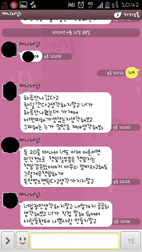 이 카톡을보고나서 벙쩌서 아무말도 하지못하고있다가 아무리그래도 하루 못나간게 이렇게 까지