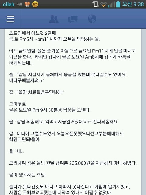 근데 사건 발생하기 전날 알바에 갔는데 주방에서는 밥하기 귀찮다고 밥먹고오라고 그래서 약간의 요깃거리로 분식을 사들고 먹고나서 속이좀 안좋고 더부룩하다는 느낌을받고 어지럽기도하고 그날 퇴근을 하고 집에갔는데 식은땀이나며 머리가 아프고 계속 토하고 이래서 아침여덟시에 사장님께 연락을 드리고 못갈것같다고 대타를 구해본다고 말을 하고 응급실에 갔다가 사람이 너무 많아 그냥 약만사서 집에 돌아와서 약먹고 잠이들어 아홉시정도에 일어나서 죄송하다며 카톡을했더니