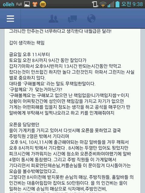 월급도 제대로 계산이 되어있지않고 친구시급을 주신다고 했는데 친구시급도 제대로 확실하게 주시지않고......그리고 구해볼게요나 구할께요 라는 그런 말한마디 가지고 트집도잡고...더어이없는점은 저만키를 가지고 있는게 아니라 알바생들 몇 도 키를 가지고있고 사장님께서도 키를 가지고 계셧었습니다 그럼 제가 연락이 되지않았던 시점 네시경을 넘어서 사장님께서 전화가왔었는데 사장님은 사장님가게인데 오픈을 왜 하지않으셨을까요....