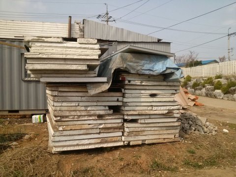 공사장 폐기물로 보이는 스티로폼 합판, 플라스틱, 각종 위험 폐기물들을 쌓아놓고