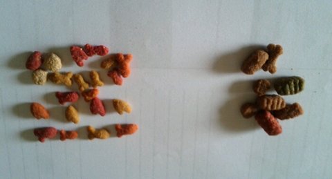 왼쪽 고양이가 좋아하는 생선모양과 애정의 상징 하트모양사료가 예쁜색깔로 되어있는반면
