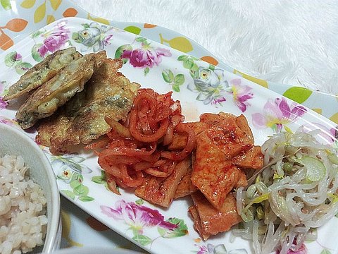 요건 굴전과 무생채 오뎅볶음 숙주 나물이에요