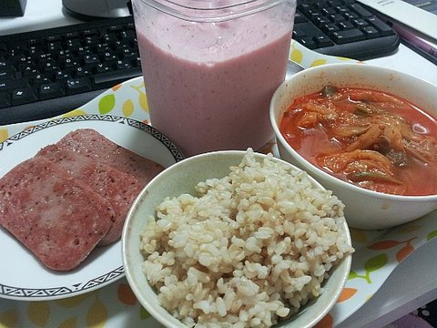 그리고 현미밥 그옆으론 김치찌개 그리고 모닝 쥬스로 딸기랑 우유 갈았어요