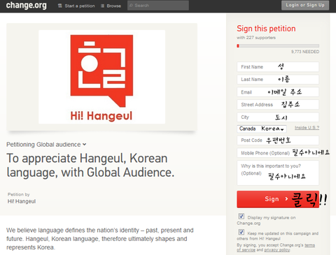 사이트 링크: http://www.change.org/en-CA/petitions/to-appreciate-hangeul-korean-language-with-global-audience