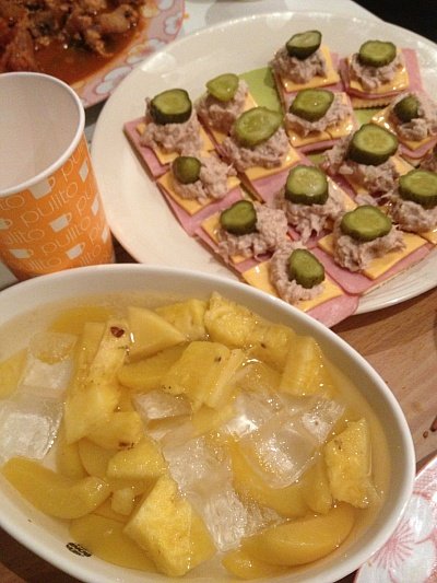나중에 후식보다는....안주로 먹었던 참치 허접 카나페와 파인애플 황도에요