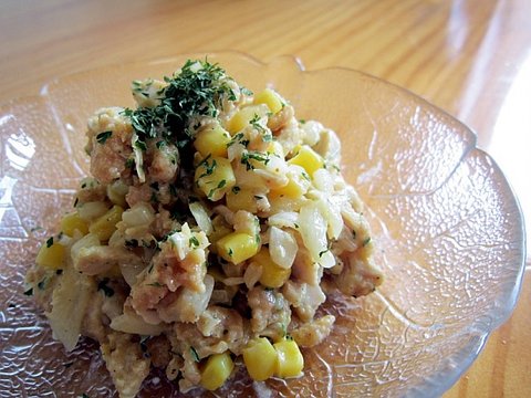 치킨 남을걸 쫙쫙 찢어넣고 양파 다진거랑 스위트콘을 물기 빼고 섞음.