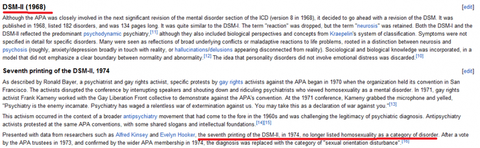 'DSM'이란 Diagnostic and Statistical Manual of Mental Disordersthird'로 '정신질환 진단 및 통계 편람' 즉, 미국 정신의학 협회가 출판하는 서적으로 가장 널리 사용되고 있는 책입니다. 이 DSM은 세계적인 정신 의학자들이 WHO(세계 보건 기구) 프로젝트의 일환으로서 시작했는데, DSM-2부터 동성애는 정신 질환에서 삭제되었으며, 개인의 정상적인 성적 취향의 일종으로 분류되었습니다. 1980년의 DSM-3은 미국 정신 의학회에서 작성했는데, 미국은 알다시피 과거 대표적 근본주의 기독교 국가였기 때문에 동성애를 정신 질환으로 치부했고 국가적 예산을 쏟아부어 동성애를 정신 질환으로 설명하려 했지만 실패. DSM-3에서도 동성애는 여전히 정신 질환이 아닙니다. DSM은 의사 한두명이 정하는 것이 아닌 수천 수만명의 전 세계적으로 촉망받는 의사들이 모여서 회의를 거쳐서 장기간에 걸쳐 정하는 것이므로 분명 신용있는 자료라고 할 수 있지요. 미 의학 협회, 미 정신병 치료 협회, 미 심리학 협회, 미 정신 분석학 협회, 미 소아과 협회, 미 전국 사회 사업가 협회 등의 모든 기관들이 "동성애는 정신병이 아니며, 이는 치료할 필요가 없다."라는 공식 입장을 발표했습니다. 따라서 동성애는 '질병'이 아닙니다. '고친다'는 표현도 맞지 않구요. 동성애가 전염된다는 것이 입증되려면 동성애가 자유로운 서유럽의 국가들은 동성애 인구가 기하급수적으로 늘어났어야 합니다. 하지만 그 동안 숨어지내던 사람들이 커밍아웃하며 나오는 인구와 인구 증가에 따른 동성애자 증가일 뿐, 전혀 그렇지 않습니다. 이 말을 듣고서도 "동성애 문화가 표출되고 인정하는 추세가 되면 사람들이 동성애자가 될 것이다."라는 소리를 하는 사람이 있더군요.