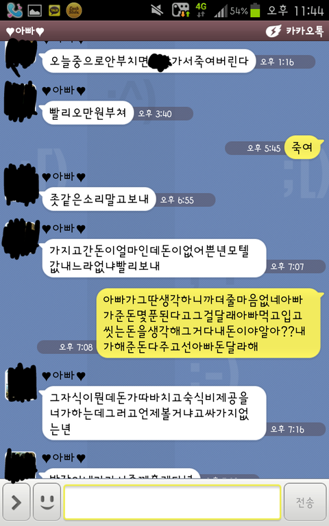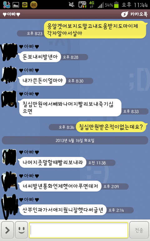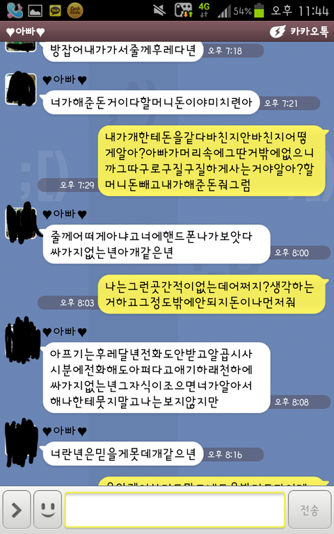 제가 저번주에 아파서 집을못갔습니다 매주가던집을안가고 아파서 응급실에혼자가니까 집생각이나서 아빠에게연락하려고 핸드폰을봤는데 두번정도 전화를 못받았더니 카톡으로아빠가 '내가준돈내놔라 ㅁㅊ년 ㅈ같은소리하지말라'등 욕을하셨습니다