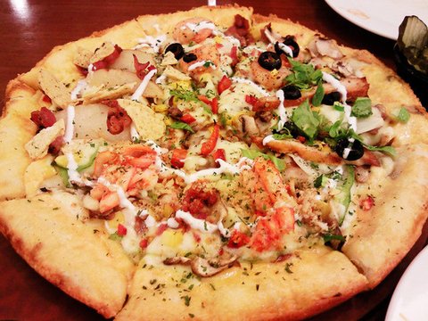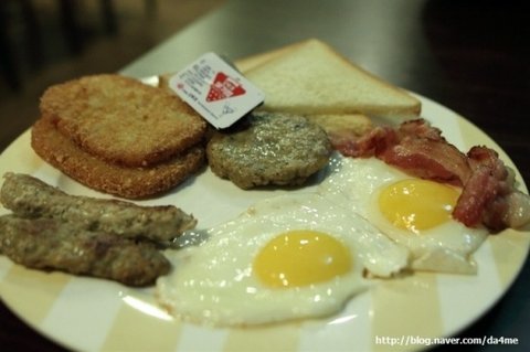 29. 아메리칸 다이너의 아침식사-시럽, 와플, 프라이드 홈 포테이토, 계란, 베이컨 등이 한 접시에 가득 나오는 다이너에서의 식사를 가리킨다.