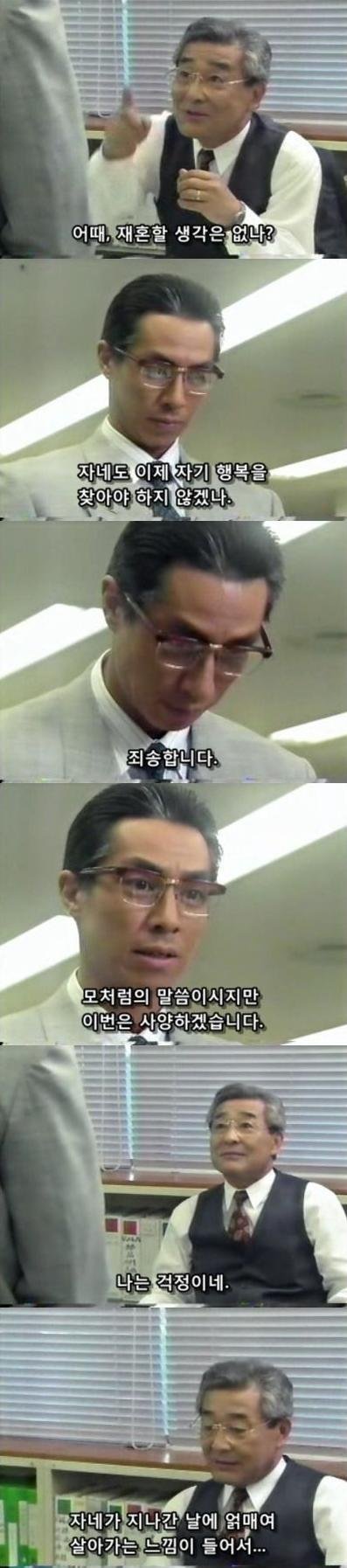 오늘의 남주는 중년의 직장인임. 부인과 사별후 쭉 홀로 지내면서 주변의 소개를 마다하는둥 재혼할 생각이 없어 보이는 남주는 상사의 제안을 사양함.