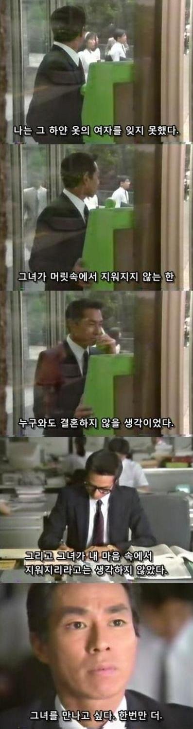 직장인이 되서도 아직 하얀옷의 여자를 잊지 못하는 남주의 그 여자를 만나고 싶은 마음은 너무 커져버려서 그녀를 잊기전까진 다른 여자와 결혼을 하지 않을꺼라 생각하는 지경까지 이른 남주.