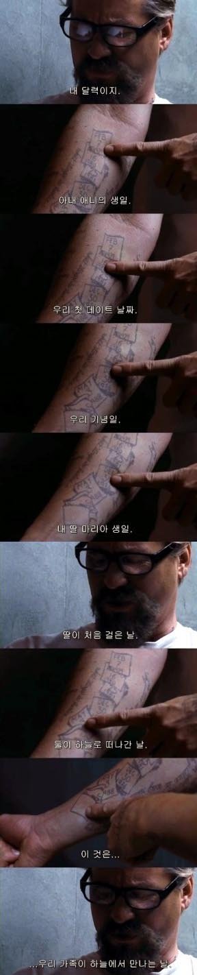 영화 '펠론' 살인범들이 자기의 아내와 딸을 살해하자, 복수극으로 살인범들의 주변인물들을 다 살해한 다음 교도소에서 죽을날을 기다리던 자의 문신