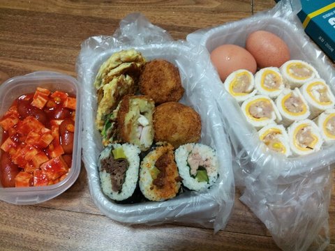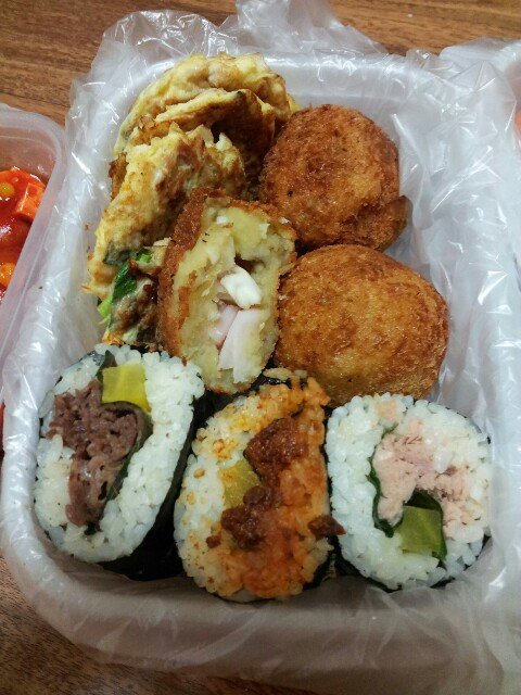 김밥, 샌드위치, 동그랑땡, 소세지두부볶음, 고구마크로켓,