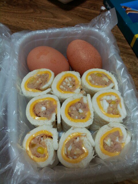 그리곤 샌드위치 속을 만들어 식빵을 밀고 속을채워 말아서 샌드위치 완성.