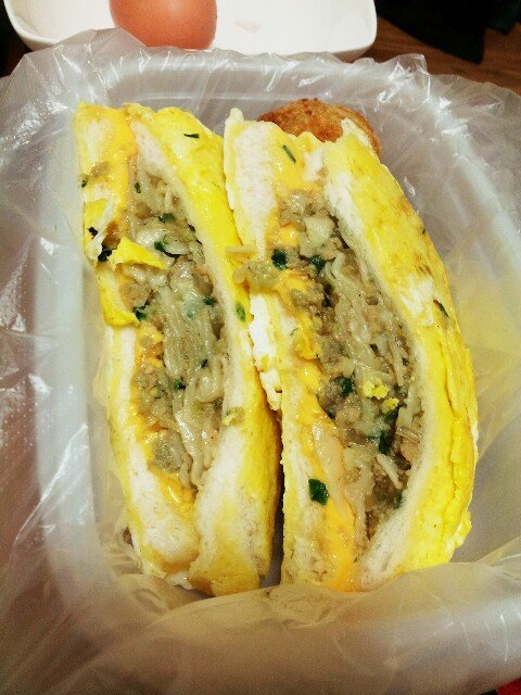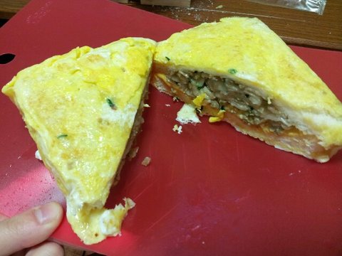 식빵위에 소복히 얹어 치즈한장을 촥 얹고 계란물을 아래위로 끼얹어 익혔음