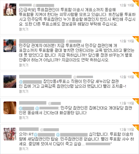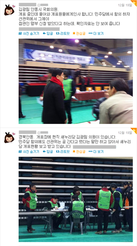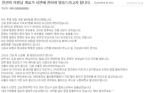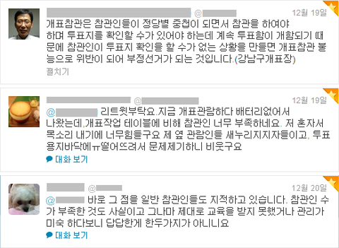 초반 박근혜 당선 확정 분위기로 개표 후반에는 느슨한 참관 분위기가 조성. 개표가 새벽 늦게까지 진행된 서울의 경우 중간에 집에 간(취침, 다음날 출근 준비) 참관인도 많았다는 증언.
