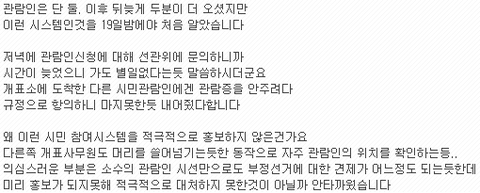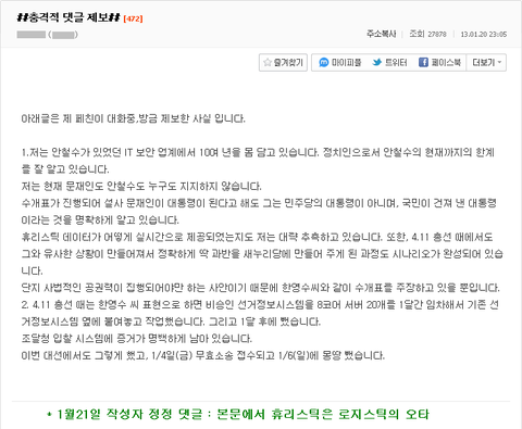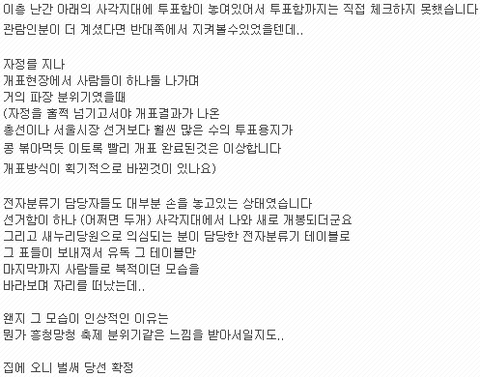 일부 발췌 : 법적으로 인정되는 공식선관위 개표소에서 전자개표 집계로 상황표 만들고 '수개표'안 한 곳이 어제 부천 소사선거구에 이어. 강원도 춘천 '호반체육관' 개표소에서 참관인 증언이 또 나왔습니다.