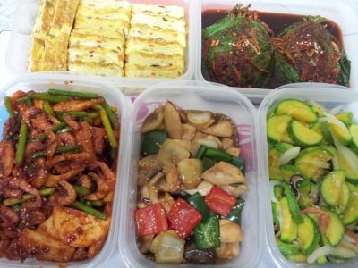 계란말이,깻잎절임,마른새우고추장볶음,버벗볶음,애호박 볶음