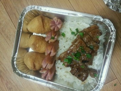 유부초밥과 소세지,삼겹살을 양념해서 밥위에올림 간단하고쉬운 도시락