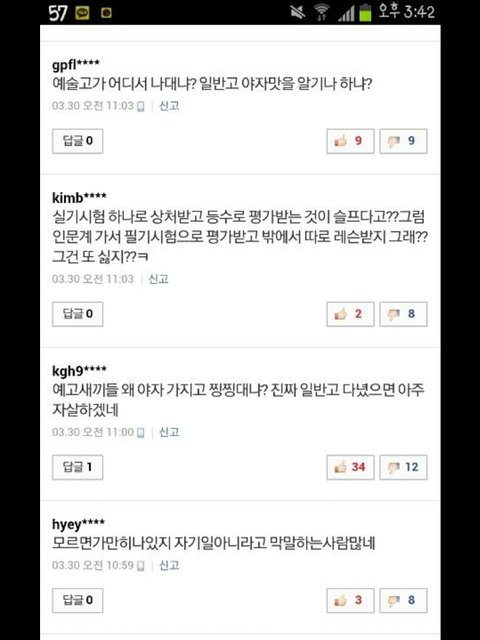 너무 부정적인 시선으로 바라보지 말아주셨으면 해서 이 글을 썼어요. 저희는 인문계 학생들을 비하한 적이 없어요. 인문계가 힘들지 않다거나 예고가 무조건적으로 좋다고 하는 그런 말이아니라 잘못된 오해는 바로잡아야 할 것 같네요.