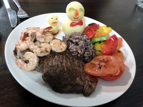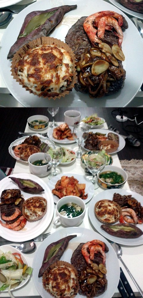 스테이크랑 국은 엄마가 도와줌.........저 소스가 별미였어요 마늘이랑 돈가스소스랑 양파랑