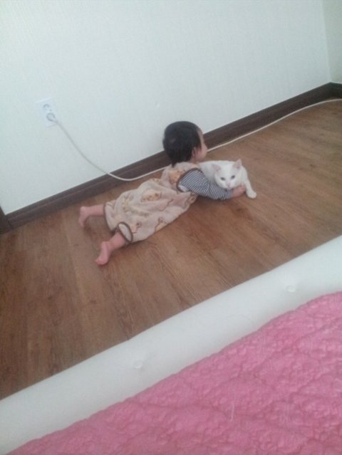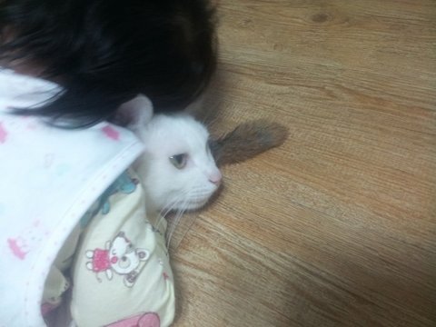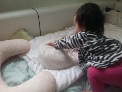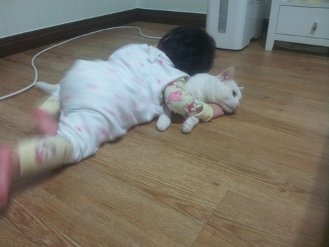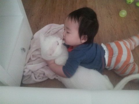냥이는 정말 싫으면 아가가 쫓아올때마다 높은데로 도망다니고 피하고 그럴텐데 근처에 자는 사진 보고 알았습니다~ 냥이가 아가를 싫어하는게 아니란걸 ㅎㅎ 단지 격한 사랑표현을 좀 부담스러워하고만 있다는걸~ ㅎㅎ