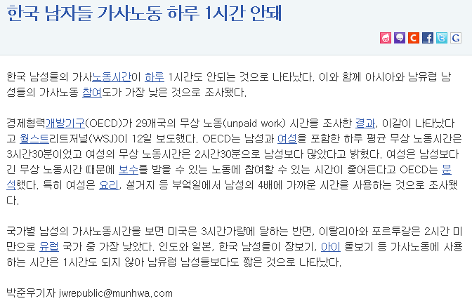 ▶ 가사노동시간 1시간미만으로 전세계최하