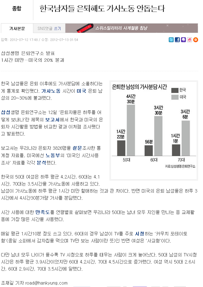 ▶ 은퇴후에도 가사전혀안돕고 맞벌이할경우도 여자가 훨씬 고생