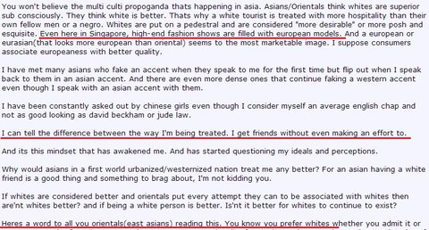 백인들은 바보들이 아니며, 그들이 아시아 및 남미에서 은연중에 우상적으로 대접을 받는것또한 물론 잘 알고 있습니다.