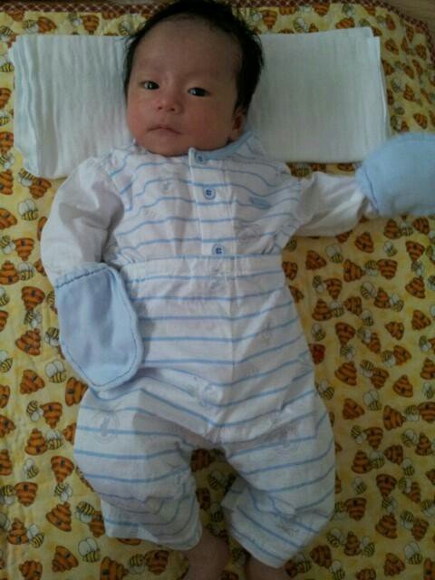 태어난 지 2주 넘었을 때 사촌동생이 사준 옷을 입었어요. 많이 크네요