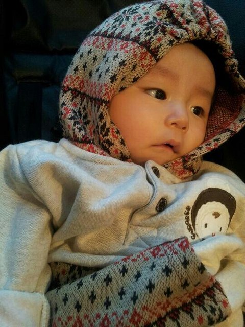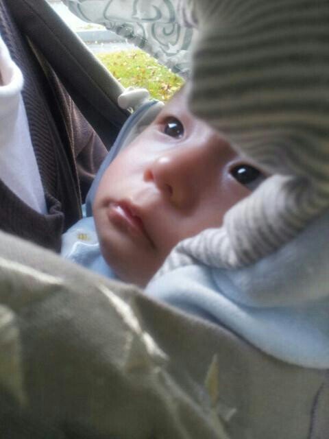 두달 쯤 됐을 때 아기띠를 하고 나갔어요. 혼자 김밥 사먹어서 그런가 입을 삐죽.