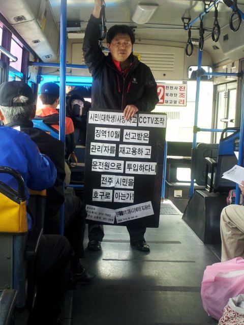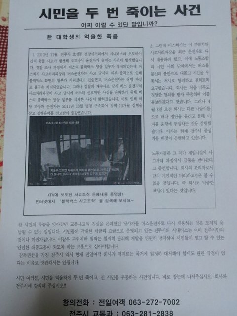 전주 버스기사로 일하고 있습니다. 버스회사에서 한 대학생을 억울한 죽음으로 몰아간 사건을 은폐시키고 그 사람을 재고용 시킨겁니다. 처음 재고용을 하였을때 시민들의 반대로 몇일간 보류했었지만 몇일후에 그 사람을 고용하여 버스기사로 일하게 하였습니다. 피해자를 가해자로 만들어버렸죠.