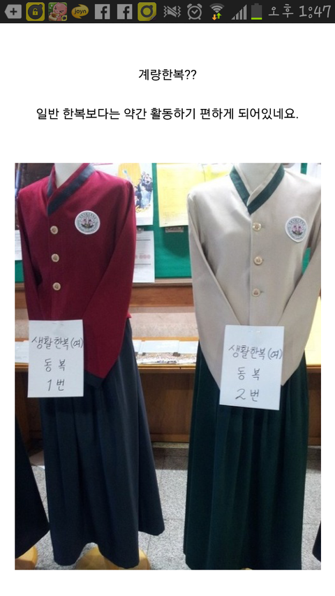 아 이제 우리 교복인 개량한복 !!!! 사실 이건 생활한복이고정식 한복으로 행사가 있을때 입는 예복도 있어요
