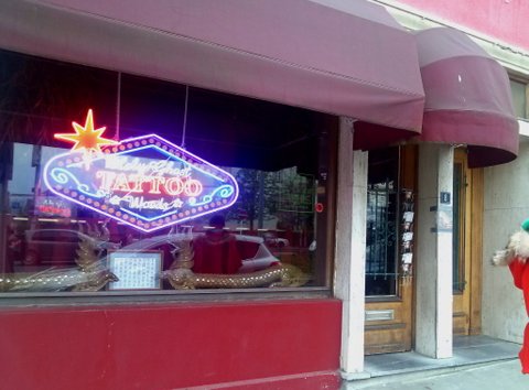 이 사진은 시내 중심가 입구의 한 타투샵입니다.